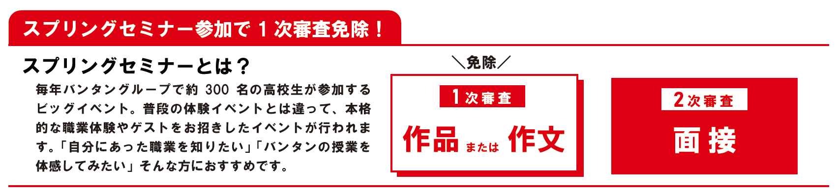 さらに・・・スプリングセミナー参加者は一次審査が免除に!?